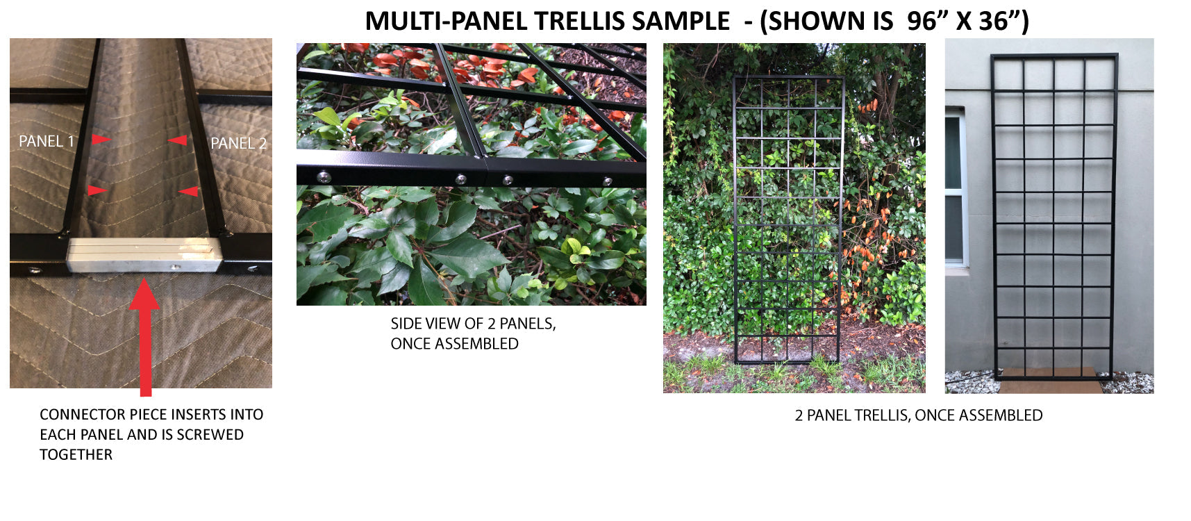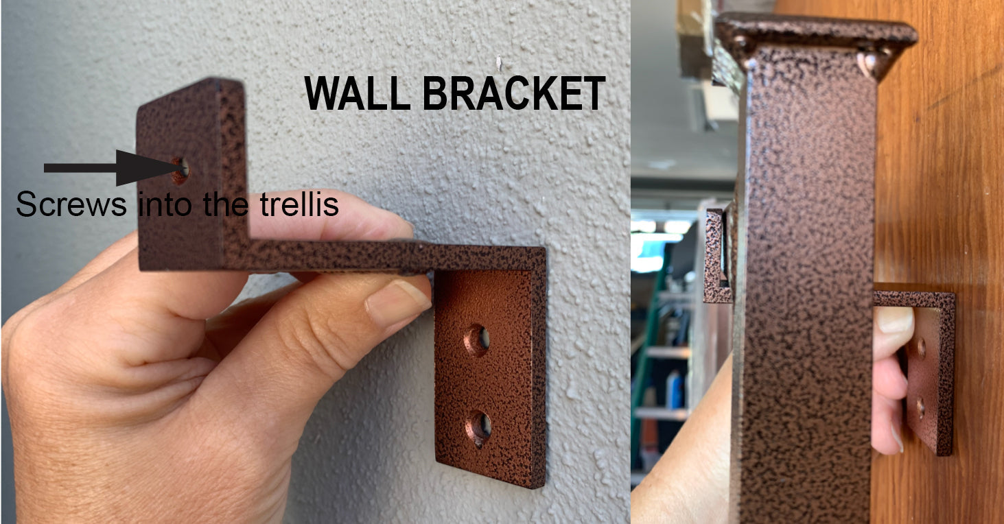 Each trellis is built in 2 equal length panels which assemble easily with 4 screws on each side. Each Trellis comes with 4 Wall Mounting Brackets or 12" Stakes with 2 Wall Mounting Brackets for upper support. Standard Wall Mounting Brackets have a 2.5" offset from the back of the trellis to the wall, once installed.Â